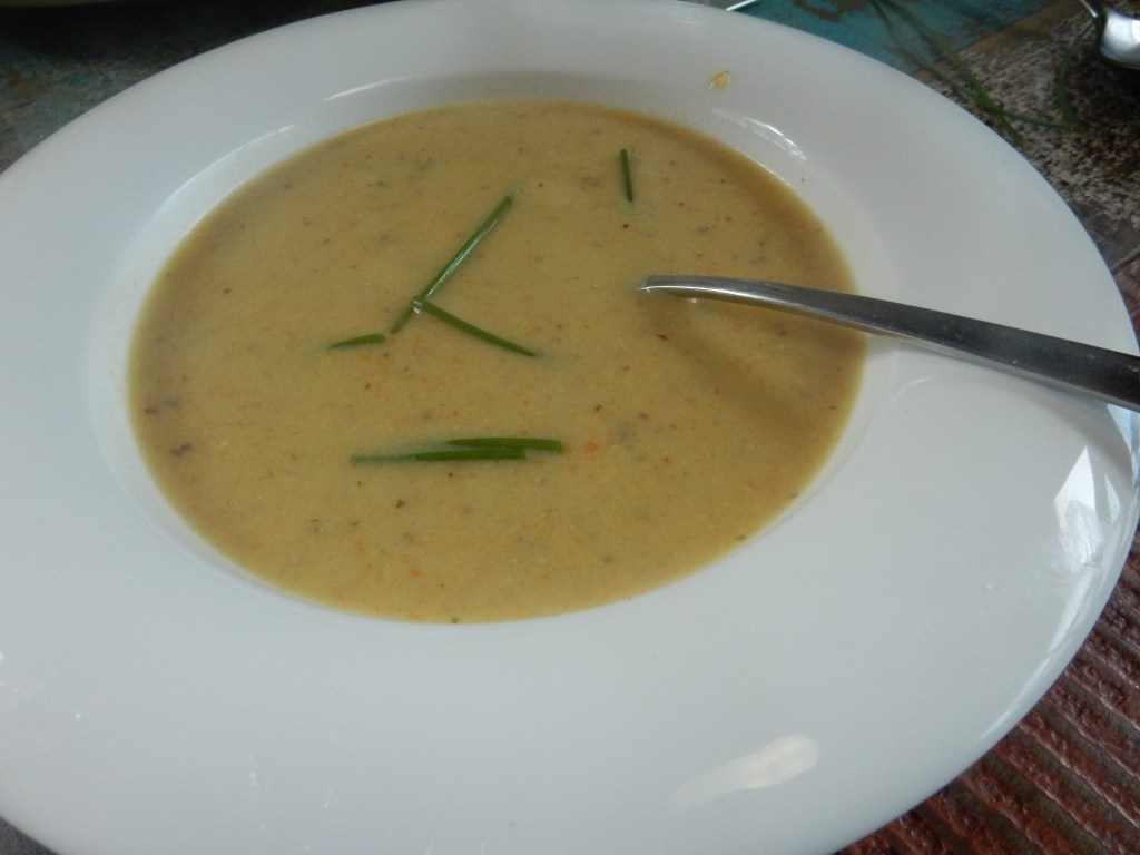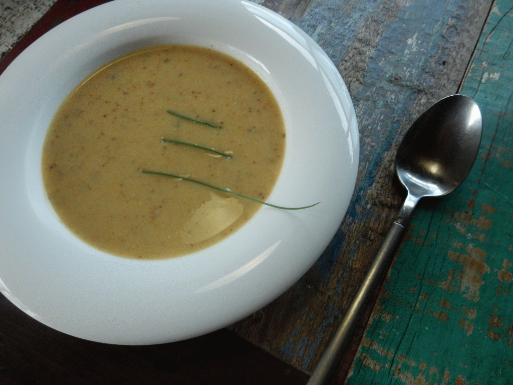 Numa panela derrete a manteiga junto com a azeite. Frita a cebola por 4 minutos . Adicione o alho poro e a cenoura e frita também uns 4 minutos. Depois adicione a farinha e mistura bem. Adicione as sabores gengibre, cominho, açafrão pimenta e miniblocos de caldo. E se tiver e quiser os temperos frescos. Deixe se grudar por 3-4 minutos e adicione a água. Deixe ferver num fogo baixo por 15 minutos, até a cenoura cozinhou. Depois tire do fogão.